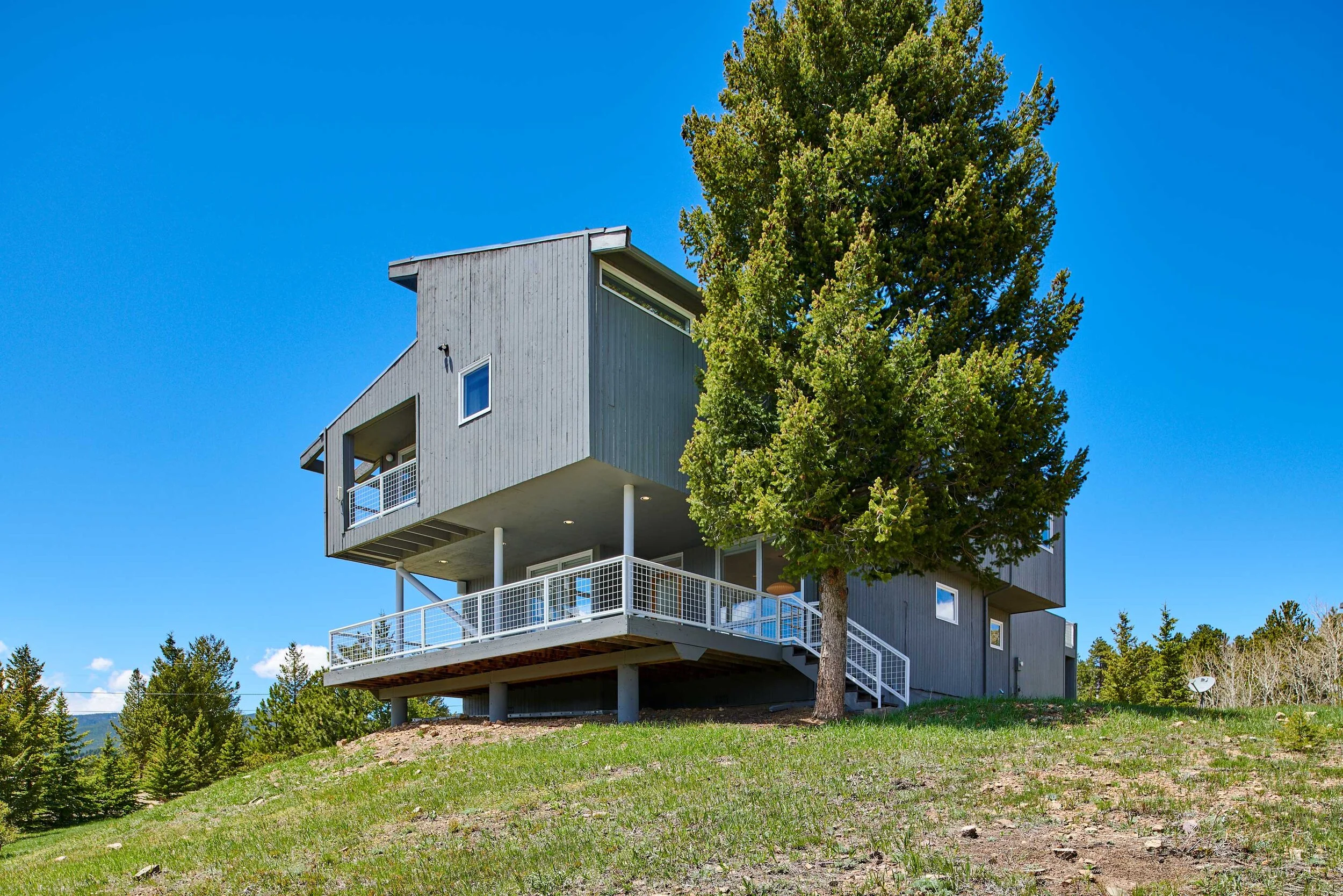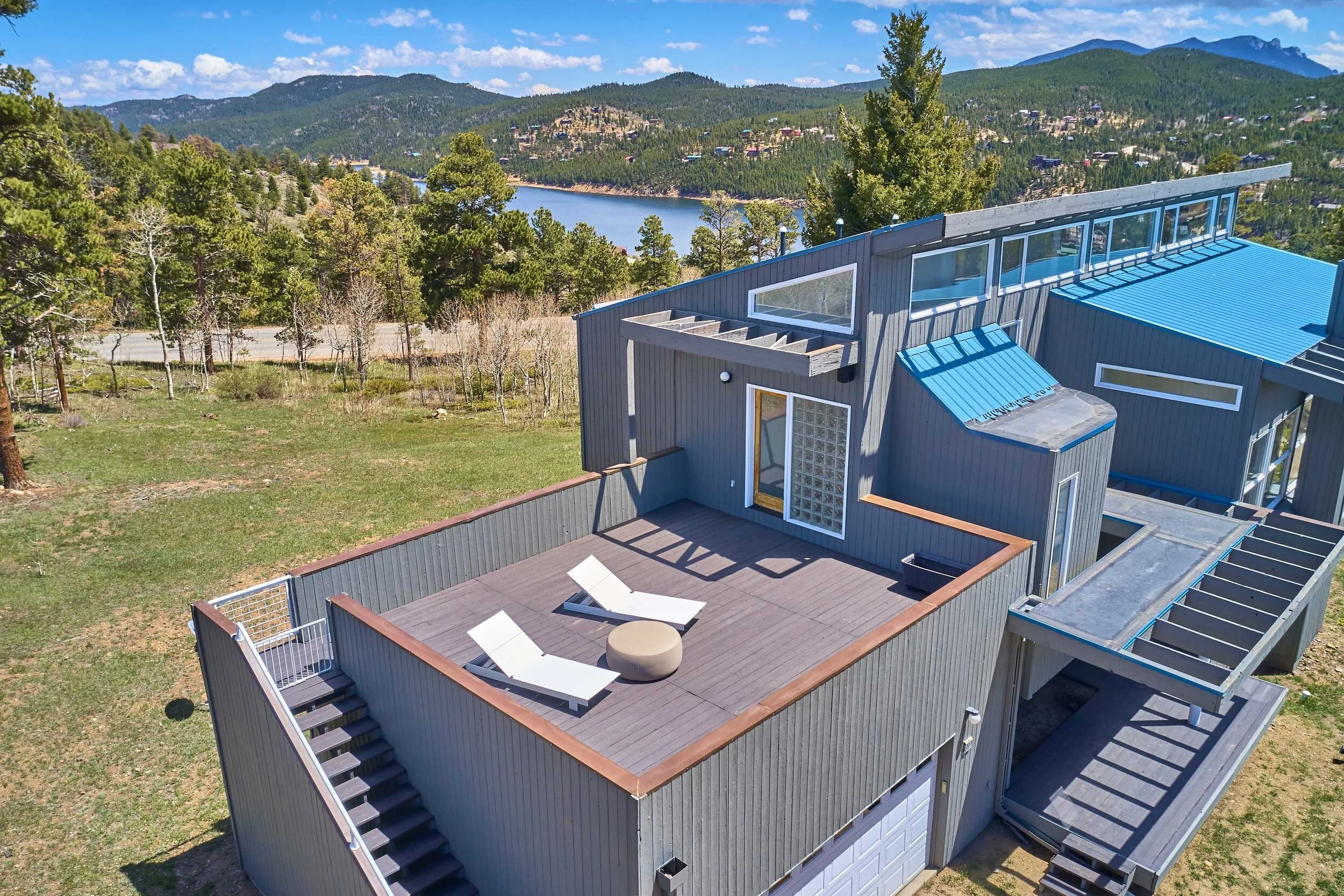 Left: A high angled view of “Malibu in the Mountains” showcasing a wrap- around deck leading to an expanse of greenery that is Colorado.