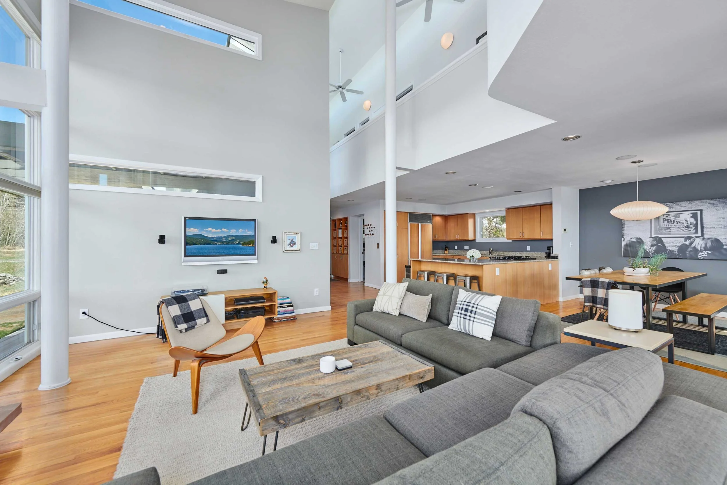 Above: The modern living room with full height windows enable sweeping views of vast foliage and natural elements surrounding it. Perfect for enjoying each season from the comforts of home.