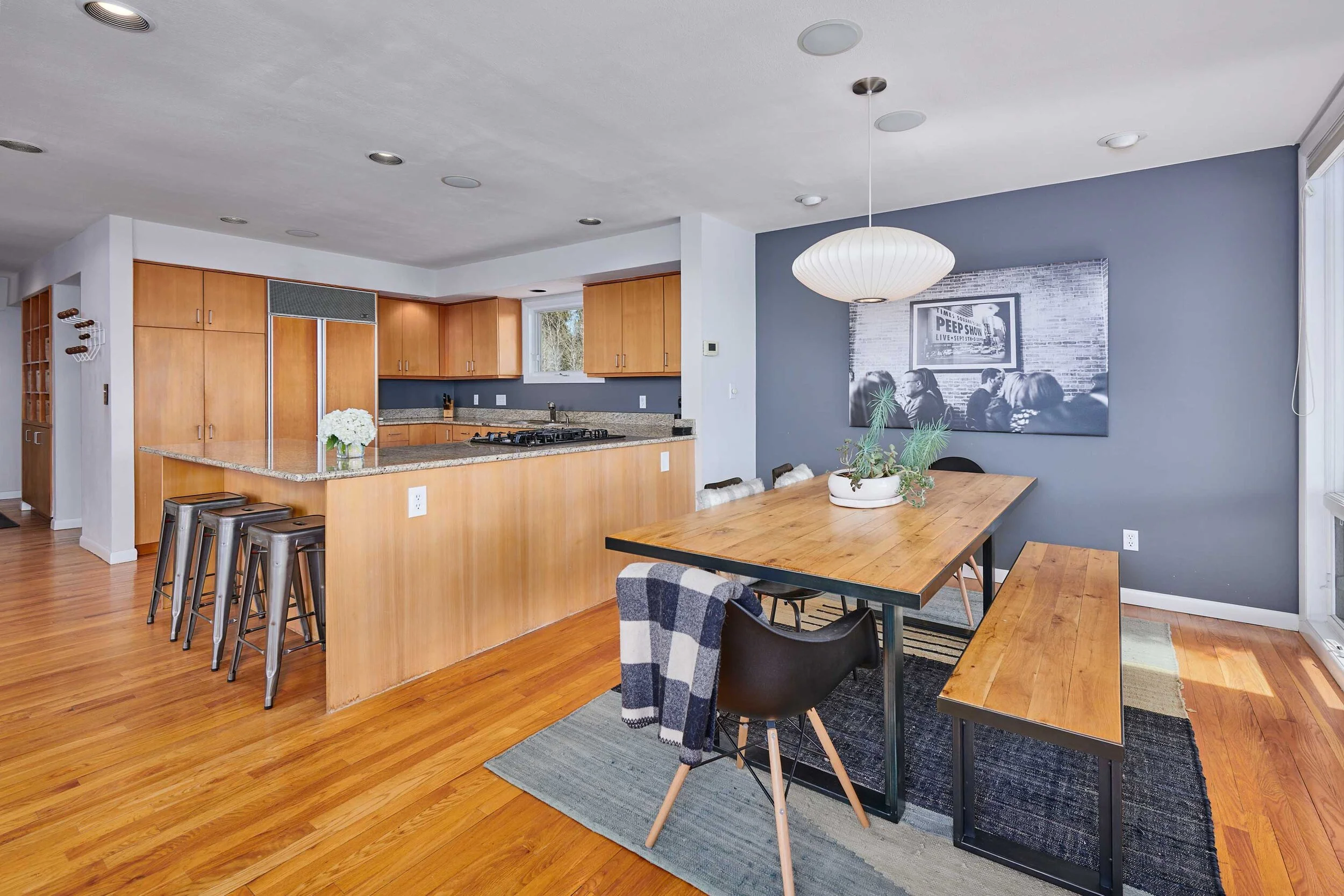 Left: Cool tones and natural wooden elements in kitchen and dining room marry brilliantly. “Malibu in the Mountains” mixes eclectic design with a lodge vibe, giving this unique space a comforting feel, without compromising the luxuries of life.