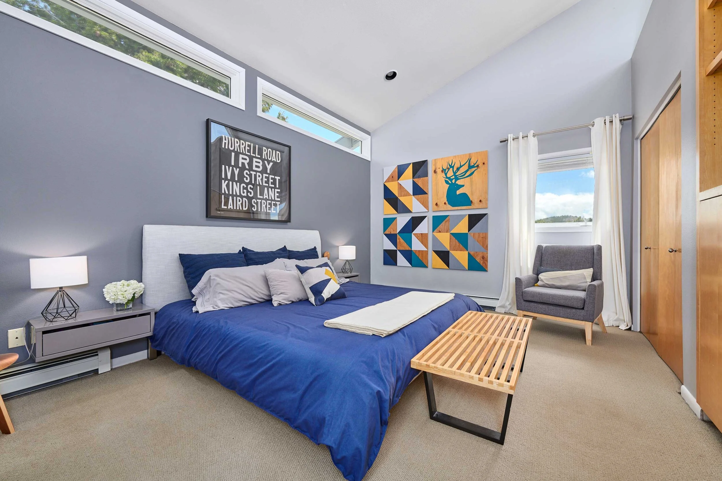 Right: A sloped ceiling was created to expand bedroom and allow for natural lighting by way of transom windows creviced atop a large closet.