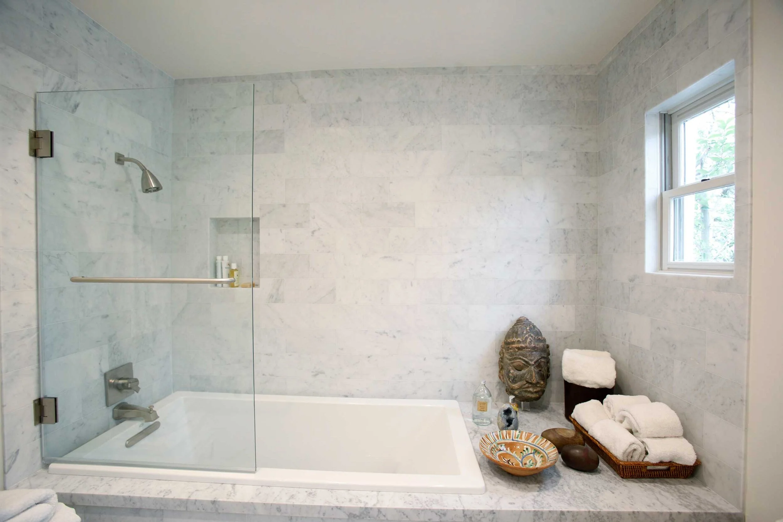 Right: Marble lined spa tub brings a calming essence for any who wish to enjoy a soothing bath.
